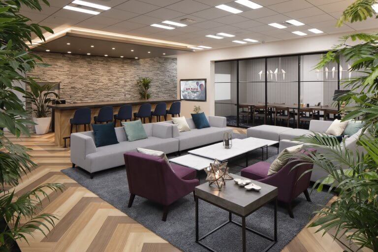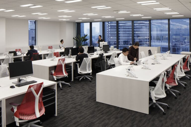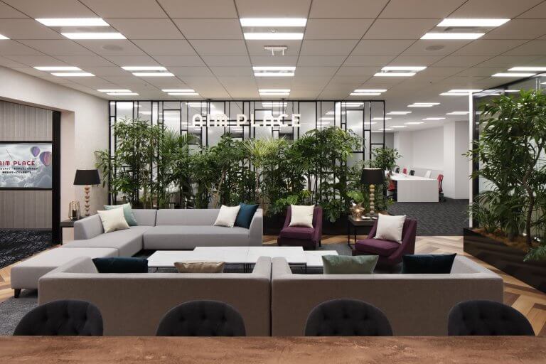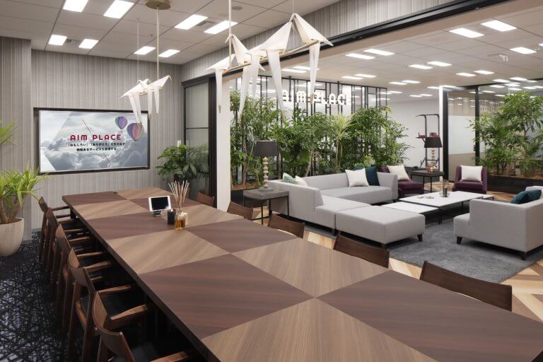 独自のSEO技術を武器に急成長を続けるITベンチャー 株式会社エイムプレイス。 今回のオフィスの移転新装は、社員がワクワク・ドキドキできることが最大のミッションでした。 デザインコンセプトは「Openness」「Feel nature」「Lounge」。 もっとオープンに、もっとリラックスできる空間をつくる。 会議室と執務空間を閉じた空間にせず、オープンスペースの中にそれぞれの機能を持たせ、植栽により空間を仕切りました。 オフィスに入ればすぐそこにはバーカウンターとラウンジ。 飲食を楽しみながら会議もできるよう大型のスクリーンも設置しました。 社員が常にワクワクドキドキできるオフィスであること、驚きと感動に溢れる空間であることを大切に設計しました。