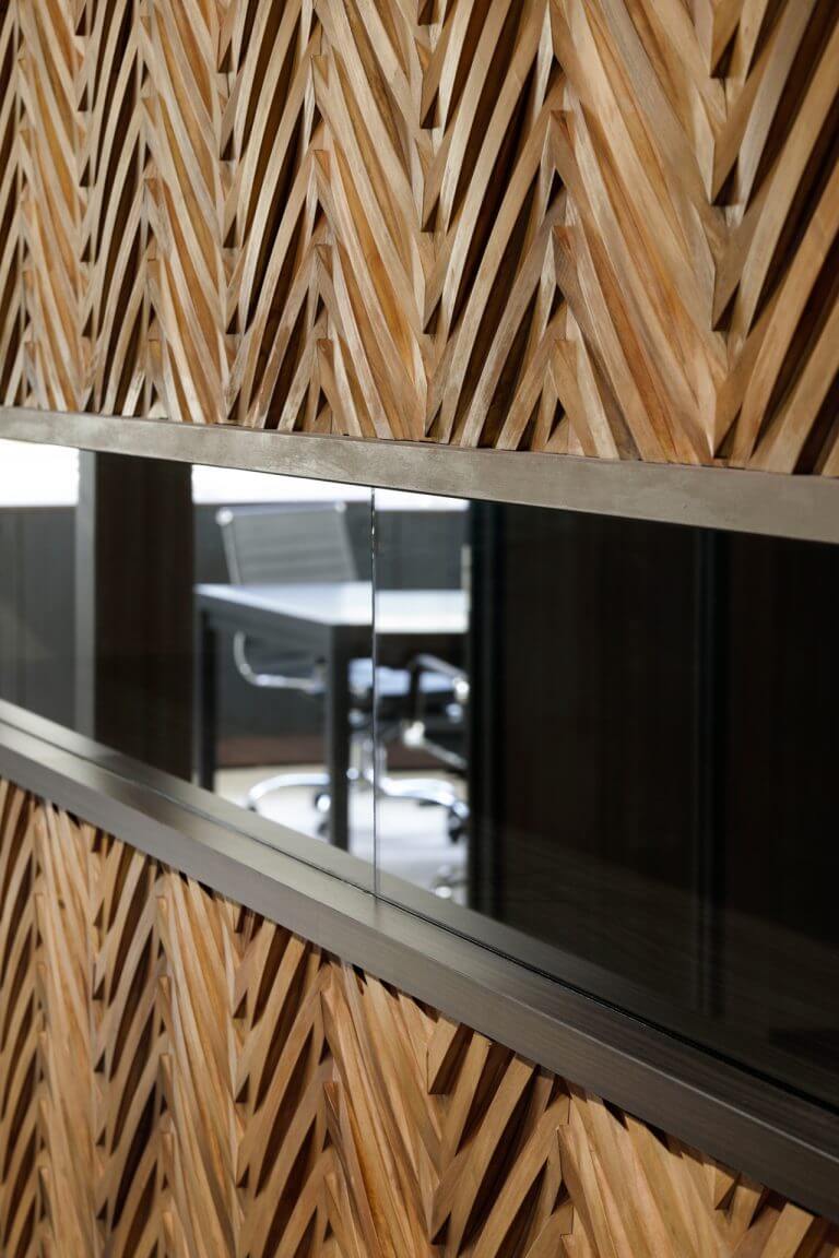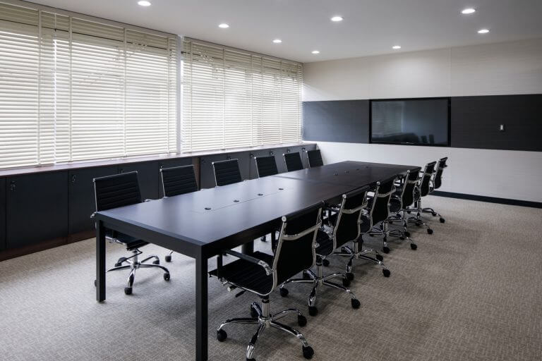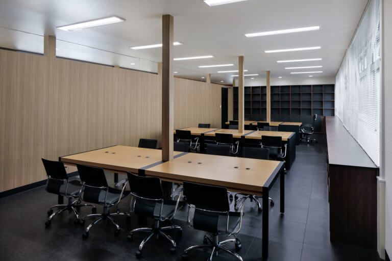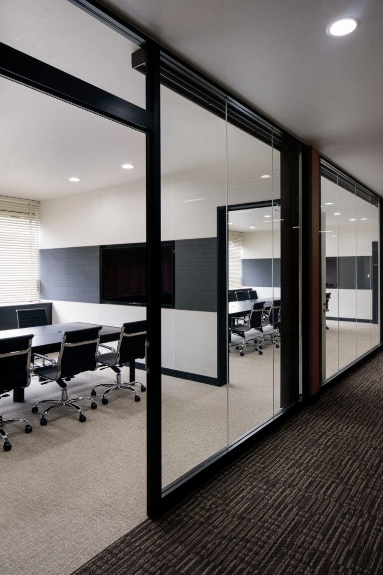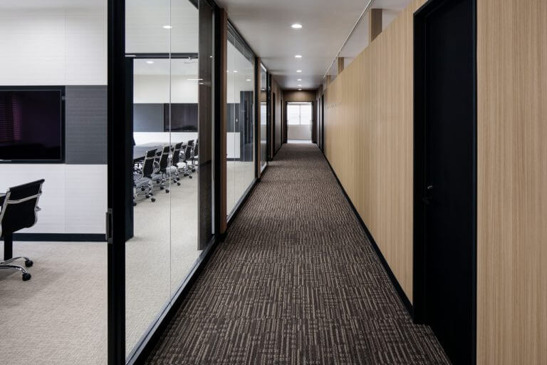 日本鋳造株式会社の川崎工場のオフィス。スチールのフレームやガラスの間仕切壁、落ち着いた色使いにより、技術・品質にこだわった歴史ある企業を表現すると共に、立体感が強調される様に編んだヘリンボーン柄や明るい木目を空間の随所に差し込むことで、工場で働く人達の安らぎの場となるよう意図してデザインしています。