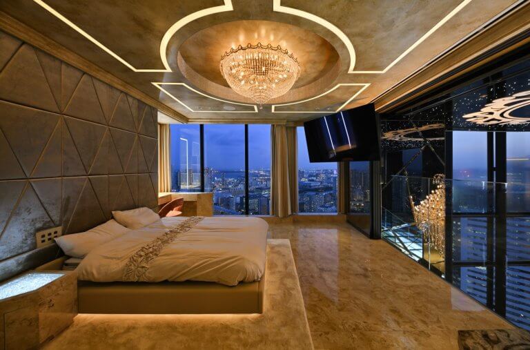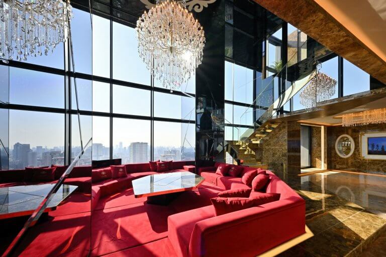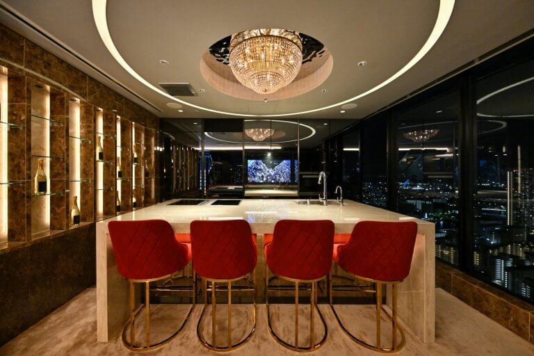 瞬く星空天井を施した吹き抜けのリビングは、シャンデリアやオプティミストのテーブル、クリスタルを敷き詰めた内照式の階段など、息をのむようなラグジュアリーなデザインに。