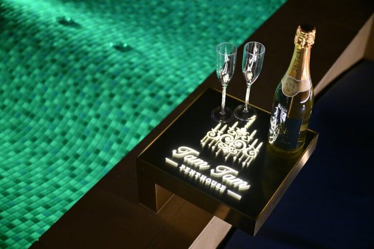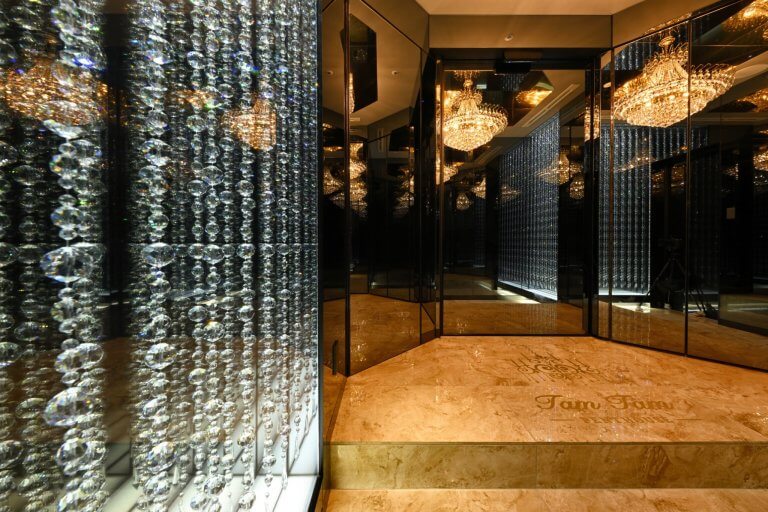 職人の技術により実現した、段差やミラーを多用した複雑なデザインがエレガントな印象を与えます。