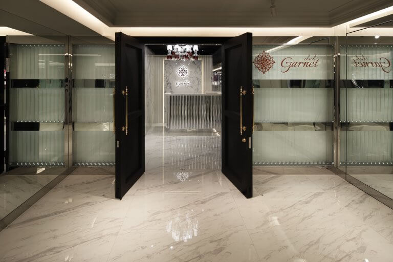 VIPルームの石目調の光壁はライトストーンパネルを使用し高級感を演出するとともに、調光式でイメージを変えられる仕様となっています。床のデザインタイル、特注照明と組み合わせエレガントな空間に仕上げました。