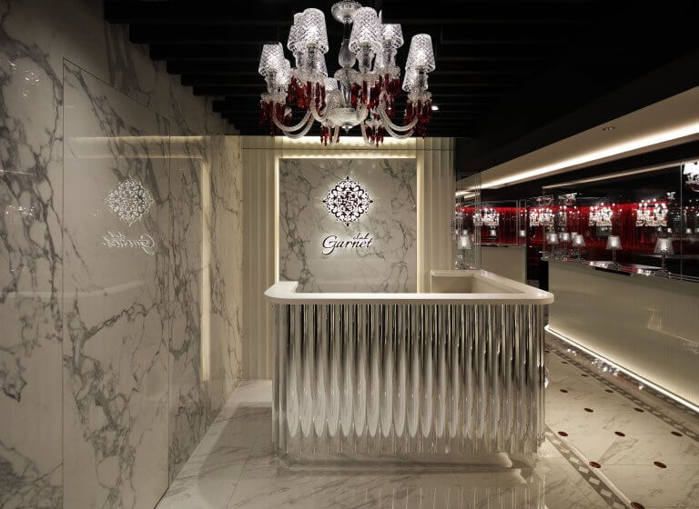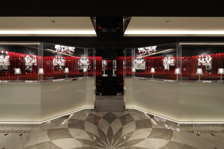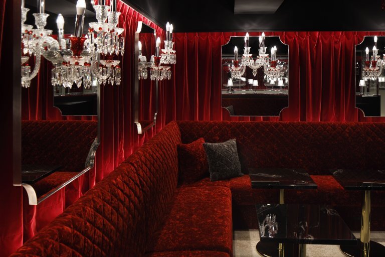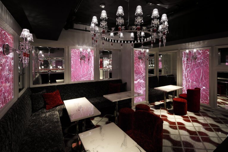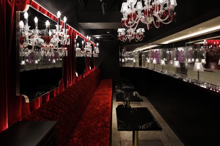 天井が低めの店内には、小型のシャンデリアやウォールランプなどの意匠照明をふんだんに配置して豪華さを演出。クリスタルの輝きがフロアを美しく照らします。